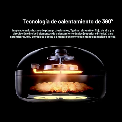 𝟯𝟲𝟬° 𝗖𝗮𝗹𝗲𝗻𝘁𝗮𝗺𝗶𝗲𝗻𝘁𝗼 𝗧𝗲𝗰𝗻𝗼𝗹𝗼𝗴í𝗮 | Inspirado en hornos de pizza profesionales, Typhur reinventó el flujo de aire y Los angeles circulación de Los angeles freidora de aire, reduciendo el tiempo de cocción hasta en un 30%. Elementos calefactores dobles (awesome e inferior), garantizan que tu comida se cocine uniformemente con menos agitación o volteo. Junto con sensores de temperatura duales, este innovador sistema ofrece deliciosos resultados en todo momento.