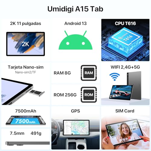 Especificaciones: UMIDIGI Tablet 11 Pulgadas, Tablet Android 13 16(8+8)GB RAM+256GB ROM (1TF), Dual SIM 4G Tablet con Lapiz, 7500mAh, 2K, 2000 * 1200HD, 13MP, Tablet PC Octa-Processor/GPS/BT5.0/Face ID-A15 Tab Tableta