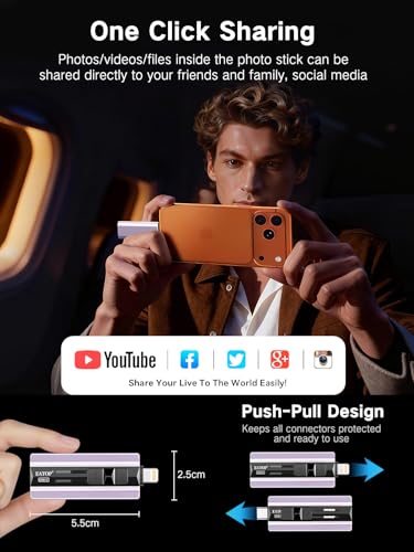 Fácil de respaldo, disfruta en cualquier momento y en cualquier lugar: enchufar y usar y fácil de operar: copia de seguridad rápida de videos, fotos, contactos y documentos sin copiar o pegar tediosos. No se requieren aplicaciones de terceros; simplemente conecte la unidad a su iPhone, iPad o dispositivo Android y opere a través de la aplicación «Archivos». También puede compartir archivos directamente desde el iPhone Photo Stick a las redes sociales, compartiendo instantáneamente momentos maravillosos con amigos y familiares.