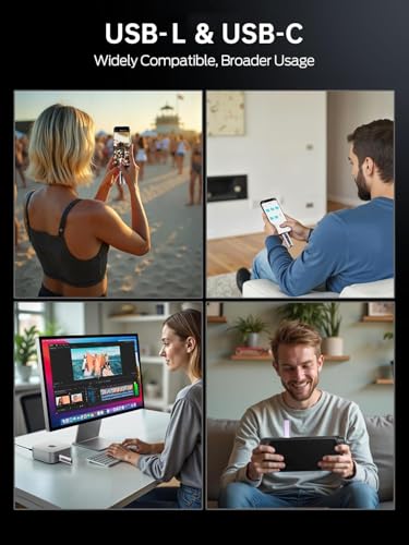 Compatibilidad universal con interfaces duales: con adaptador de puertos USB-C, USB-L, este dispositivo de almacenamiento de fotos para iPhone se conecta perfectamente con dispositivos iPhone/iPad, teléfonos Android OTG, portátiles y tabletas. Sin tarifas de iCloud, no requiere Internet, simplemente conecte y mueva archivos libremente entre su teléfono, computadora y otros dispositivos.