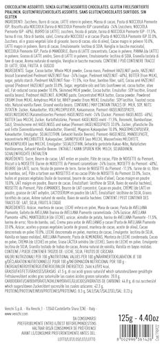 CHOCOLATES SURTIDOS. SIN GLUTEN INGREDIENTES: Azúcar, manteca de cacao, LECHE entera en polvo, Masa de cacao, Pasta de AVELLANA Piamonte, Galleta de AVELLANA (harina de AVELLANA Piamonte caramelizada -24% (azúcar, AVELLANA Piamonte -48%), MANTEQUILLA (de LECHE), azúcar, almidón de patata, harina de AVELLANA Piamonte -11,5%, harina de arroz, fibra de bambu, sal), Crema para untar de AVELLANAS y cacao (Pasta de AVELLANA Piamonte 33.0%, Azúcar, aceites y grasas vegetales (aceite de girasol, manteca de cacao, aceite de oliva), Cacao descremado en polvo 10.0%, LECHE descremada en polvo, manteca de cacao, Emulgente: lecitina de SOJA, Vainilla en bayas molidas), AVELLANA Piamonte, Pasta de ALMENDRAS, Manteca de LECHE condensada, Cacao en polvo, CREMA (de LECHE) en polvo, Grasa LÁCTEA anhidra (de LECHE), Suero de LECHE en polvo, Emulgente: lecitina de SOJA, Granillo tostado de habas de cacao, Aroma natural de vainilla, Vainilla en bayas molidas. CONTIENE / PUEDE CONTENER TROZOS DE: LECHE, SOJA, FRUTOS DE CÁSCARA