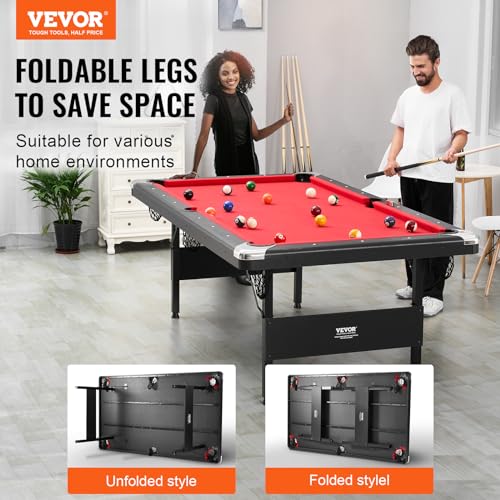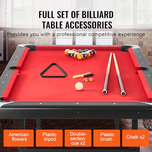 VEVOR Mesa de Billar 213,4x120x80,5 cm Kit de Billar Plegable y Portátil Set Completo de Accesorios con Bolas, Tacos, Tizas y Pincel Color Negro con Tela Roja para Sala de Juegos, Hogar, Club, Bar