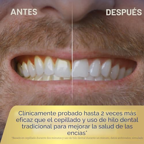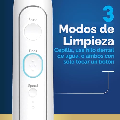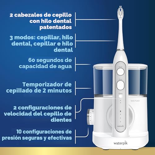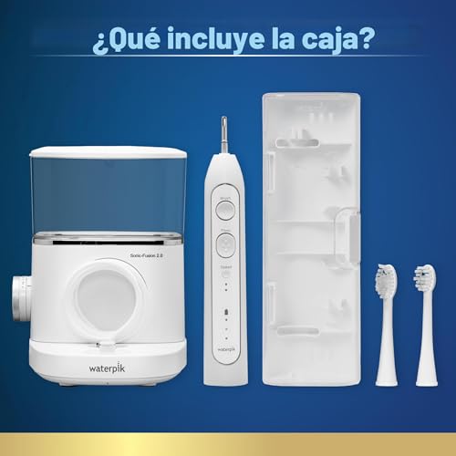 Transforma tu rutina diaria de cuidado bucal con el cepillo de dientes profesional Waterpik Sonic Fusion 2.0, un innovador cepillo de dientes eléctrico con hilo dental combinado que ofrece una limpieza dental completa en un práctico dispositivo. Este avanzado cepillo de dientes para usar hilo dental combina una potente tecnología sónica con eficacia comprobada del uso del hilo dental Waterpik por lo que es la solución definitiva para una higiene bucal superior en el hogar. Es una gran solución para cualquier persona que quiera simplificar su rutina de cuidado bucal y mejorar la salud de las encías. El Waterpik Sonic-Fusion 2.0 cuenta con 3 modos de limpieza distintos que se adaptan a tus necesidades específicas. Elija el modo de cepillo para la limpieza tradicional del cepillo de dientes sónico, el modo de hilo dental para el riego con hilo dental específico, o combine ambos juntos. Elimina hasta el 99.9% de las bacterias de la placa de las áreas tratadas que causan gingivitis, caries y mal aliento y está clínicamente probado hasta 2 veces más efectivo que el cepillado y el uso de hilo dental tradicionales. Sonic-Fusion incluye 10 ajustes de irrigador de agua personalizables y proporciona 60 segundos de tiempo continuo de hilo dental, asegurando una limpieza completa entre los dientes y debajo de la línea de las encías. El temporizador de cepillado integrado de 2 minutos con marcapasos de 30 segundos guía la técnica de cepillado óptima, mientras que el indicador de recarga te mantiene informado del estado de la batería del cepillo de dientes. Este paquete completo de irrigador oral incluye un depósito extraíble de 16 onzas para un fácil llenado y limpieza, 2 cabezales de cepillo de hilo dental en tamaños compactos y completos, 2 cubiertas protectoras para cabezales de cepillo, un estuche de viaje premium y un poste de almacenamiento de cabezal de cepillo magnético. Waterpik es la marca #1 recomendada por profesionales dentales, y el Waterpik Sonic-Fusion 2.0 es aceptado por la Asociación Dental Americana (ADA) por su seguridad y eficacia. Respaldado por una garantía limitada del fabricante de 3 años, consulte el manual del producto para obtener más detalles.