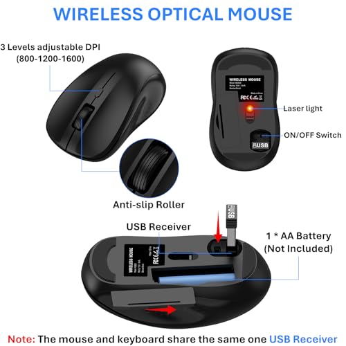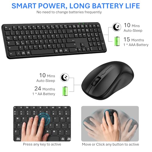 【Sleep Mode, Long Battery Life】: Wireless mouse and keyboard features with sleep mode for saving power. Idle for 10 mins, the keyboard mouse will sleep, press any button or key to wake up. You can go for months. The keyboard needs 1 * AAA battery, the mouse needs 1 x AA battery. (Battery Not Included)