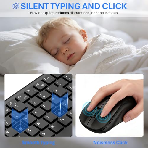 【Less Noise, More Focus】: Soft membrane keys provide a quiet and comfortable typing experience, so you can type with confidence on a wireless keyboard crafted for comfort and fluidity. The wireless mouse is almost completely silent when clicked. No more worry about disturbing others.
