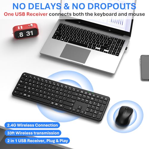 【2.4G Wireless Plug and Play】: Stable and reliable connection of this wireless keyboard and mouse is up to 10m(33ft). This keyboard combo share a nano USB receiver, no need to take upadditional USB ports. Plug and play, no software needed, convenient and efficient.