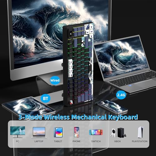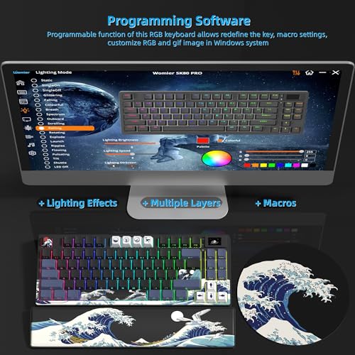 【Donde el arte se encuentra con el teclado mecánico inalámbrico para juegos】El teclado Womier SK80 PRO experimenta la fusión perfecta de arte clásico y tecnología moderna con nuestro teclado mecánico del 75 % por ciento. Cuenta con un impresionante tema de anime «Great Wave off Kanagawa», que trae arte atemporal a tu vida diaria. Teclado inalámbrico una pantalla multimedia vibrante, y un reposamuñecas suave para una completa experiencia de juego que ofrece una experiencia de juego inmersiva y verdaderamente lujosa.