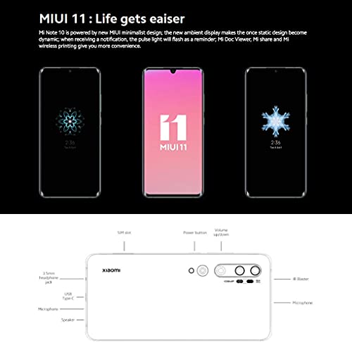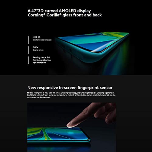 Sensor de Huellas Dactilares en Pantalla: Mi Note 10 emplea tecnología completamente nueva de desbloqueo de pantalla ultraplana y optimiza aún más la experiencia de desbloqueo con luz brillante, con los dedos secos y a bajas temperaturas. No solo aumenta la sensibilidad del botón de desbloqueo, sino que también aumenta la tasa de éxito.