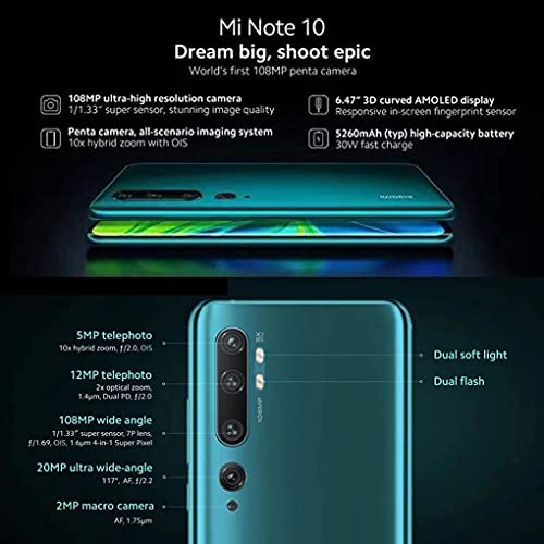 Cámara Trasera Penta: Mi Note 10 presenta una cámara de 108MP, con una resolución de foto única de hasta 12032 x 9024, ¡12 veces más alta que la resolución 4K! Con un sensor de imagen súper grande en un tamaño de 1 / 1.33 «, la cámara en Mi Note 10 supera a la mayoría de las cámaras digitales. Con teleobjetivo de 5MP + cámara de retrato de 12MP + cámara ultra gran angular de 20MP + cámara macro de 2MP.