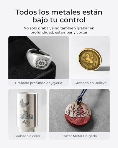 Capacidades de Corte Versátiles: Como una grabadora laser metal revolucionaria, su láser de diodo de 20W puede cortar hasta 15mm de madera y 12mm de acrílico negro, mientras que el láser de fibra de 20W puede manejar piezas delgadas de acero inoxidable (0,3mm), latón (0,4mm) y aluminio (0,2mm).