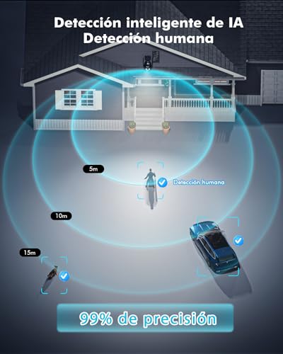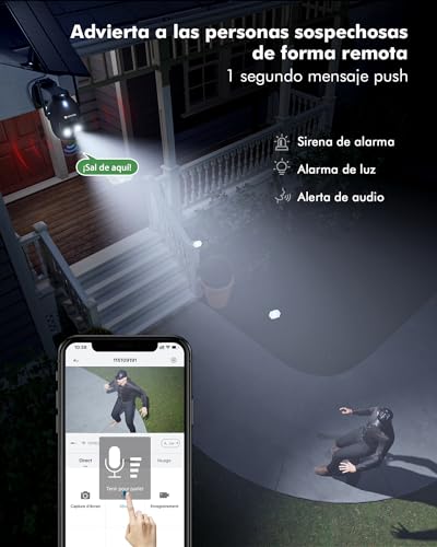 【PIR Detección y triple alerta】La cámara exterior inalámbrica tiene una versión mejorada del sensor infrarrojo inteligente PIR, puede analizar los contornos del cuerpo humano y detectar movimientos, reduciendo eficazmente las falsas alarmas. Una vez que se detecta una persona sospechosa, las luces se encenderán y la alarma será alertada. El teléfono le recordará inmediatamente (1S) y la alerta voz de cámara se enviarán inmediatamente.
