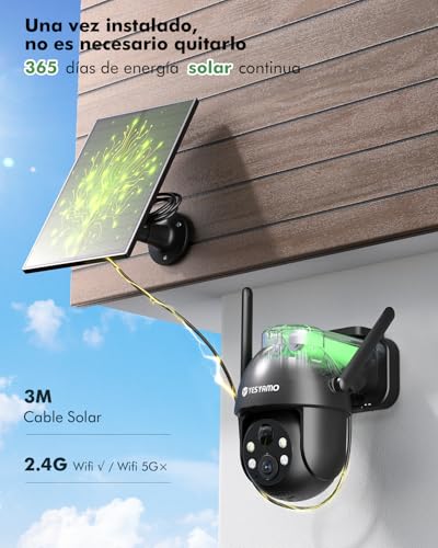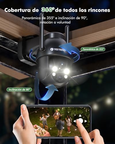 Especificaciones: YESYAMO 2K Cámara Vigilancia WiFi Exterior Solar con BaterÃa, Panel Solar, 2.4GHz Wi-Fi Cámara Exterior Solar IP66, 360° PTZ, Visión Nocturna Color, Audio Bidireccional, PIR Sirena, Negra
